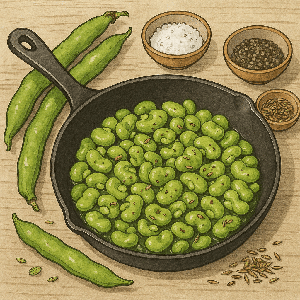 4. Réduire la température et poursuivre la cuisson jusqu’à ce que les fèves soient cuites, sans être molles
