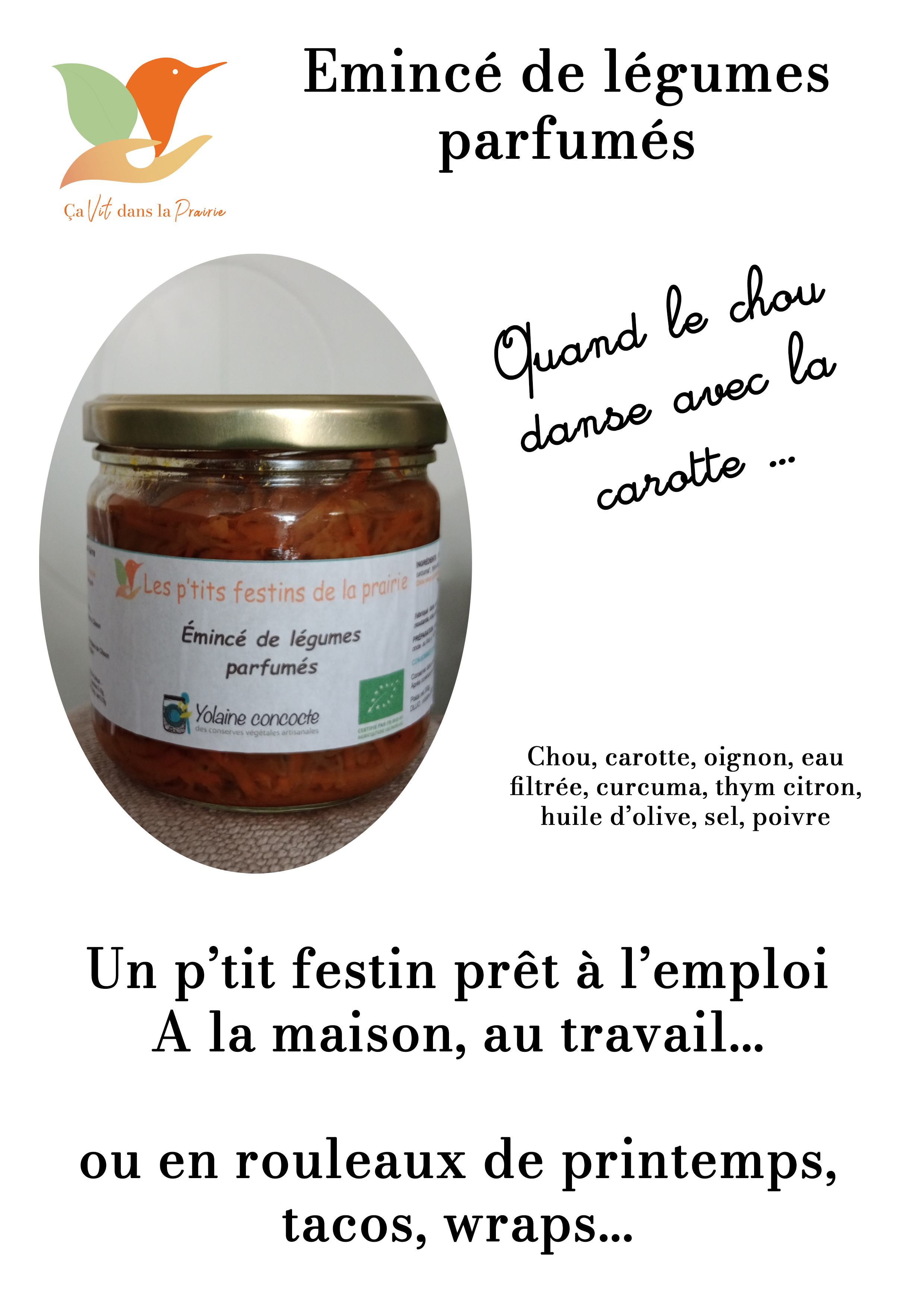 Nous sommes heureux de vous présenter les p’tits festins de la Prairie, nos bocaux de légumes bios, réalisés avec NOS légumes, par Yolaine Concocte, notre partenaire locale.